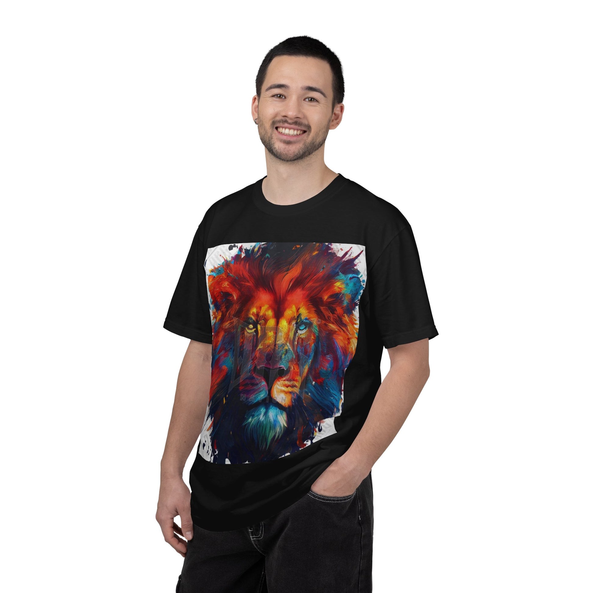 This heavyweight garment-dyed tee brings raw, artistic energy to everyday wear. A vibrant, painterly lion portrait explodes across the chest in saturated reds, blues, and golds — like a canvas you can move in. The soft, broken-in hand of the garment-dye and relaxed cut make it feel lived-in from the first wear. Wear it on city streets, at a weekend show, or layered under a jacket when you want your outfit to do the talking without trying too hard. It sits comfortably through long days and keeps its presence after many washes thanks to careful construction and double-needle seams.