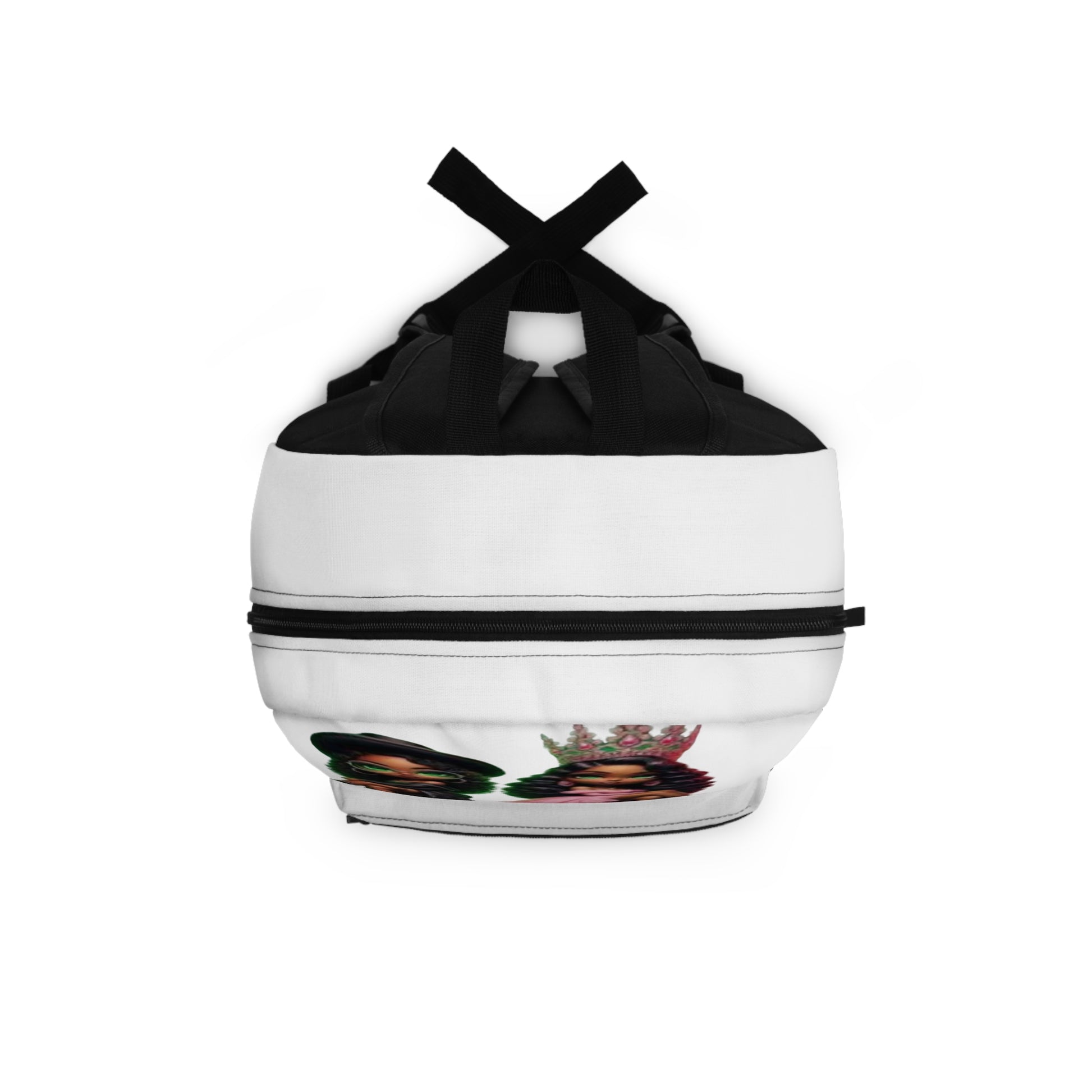This backpack brings playful confidence to everyday life. Soft-lined compartments cradle a laptop or tablet while the roomy main pocket holds books, sketchpads, or gym gear. The front zip pocket keeps small essentials within reach. Lightweight polyester stands up to daily wear and dries quickly after rainy commutes. Padded mesh on the back and straps keeps shoulders comfortable from school hallways to weekend outings. The artwork — two bold, stylish characters with crowns and expressive eyes — adds personality and attitude, turning a practical bag into a statement piece that travels with you to classes, coffee shops, and city strolls.